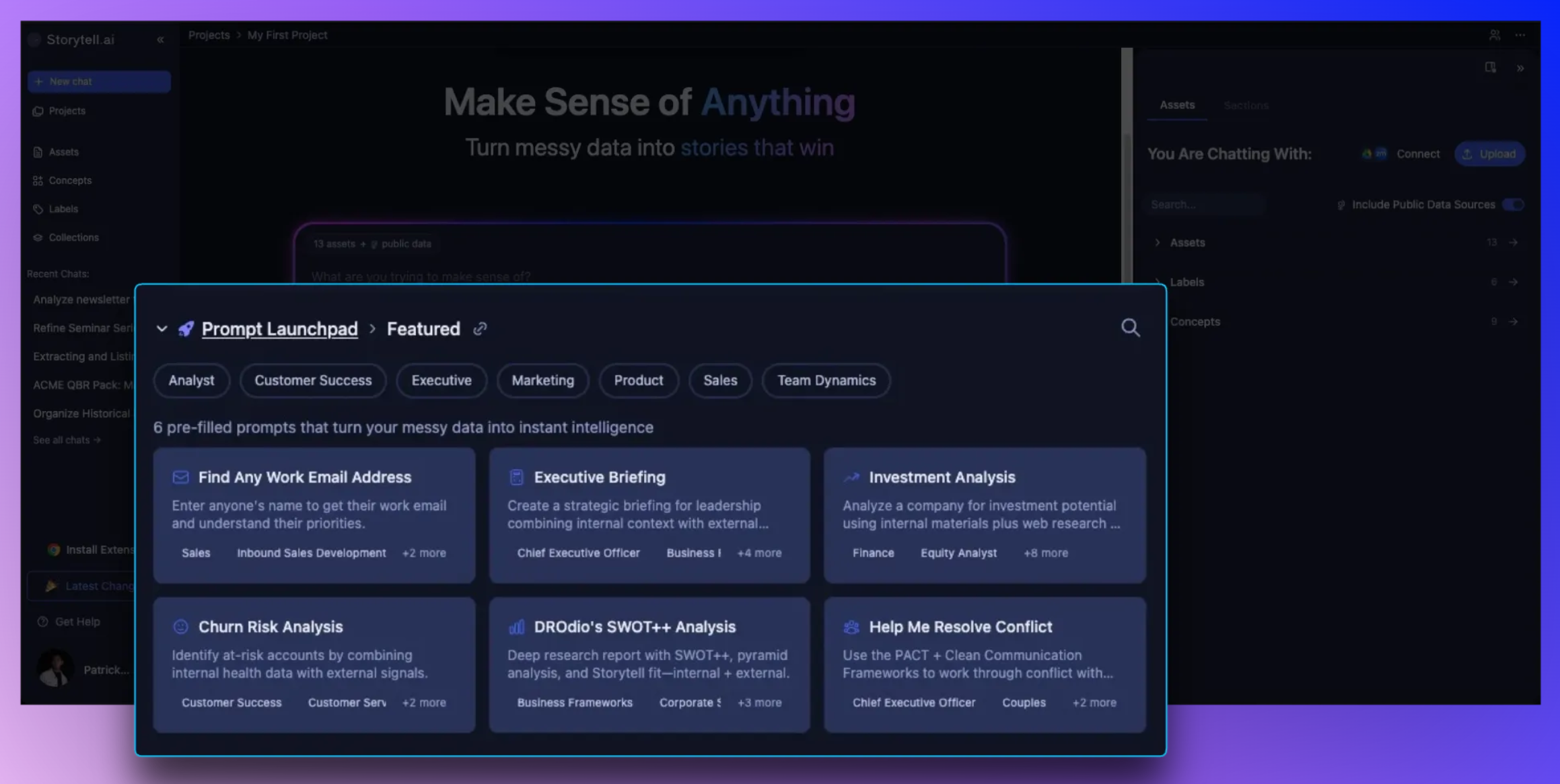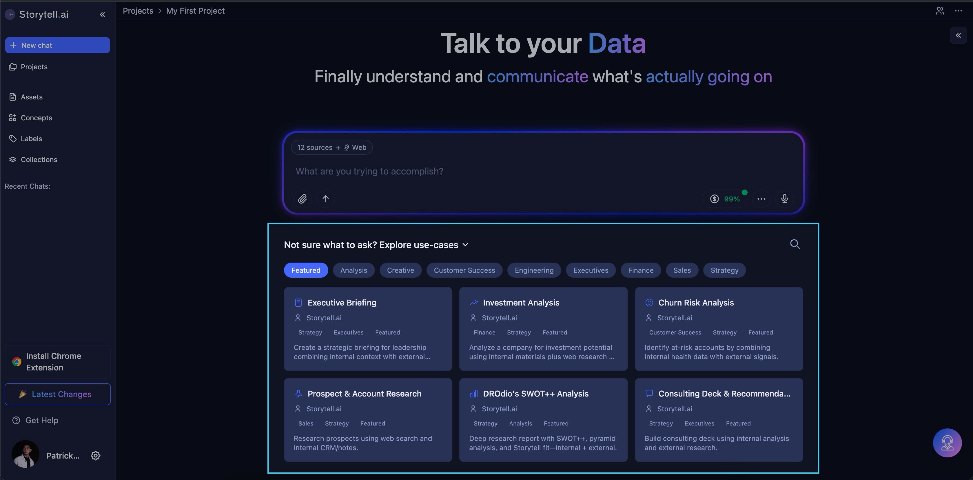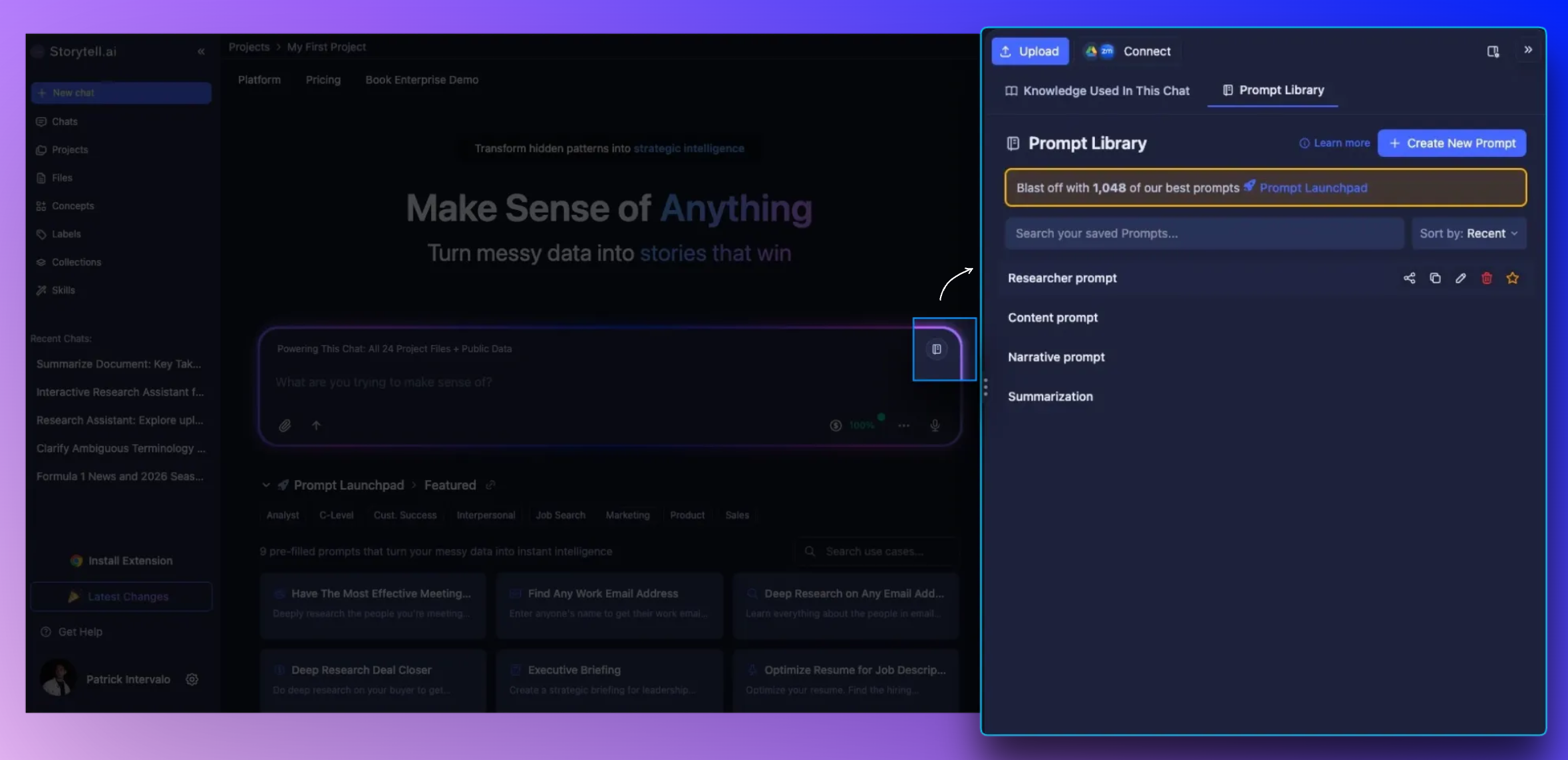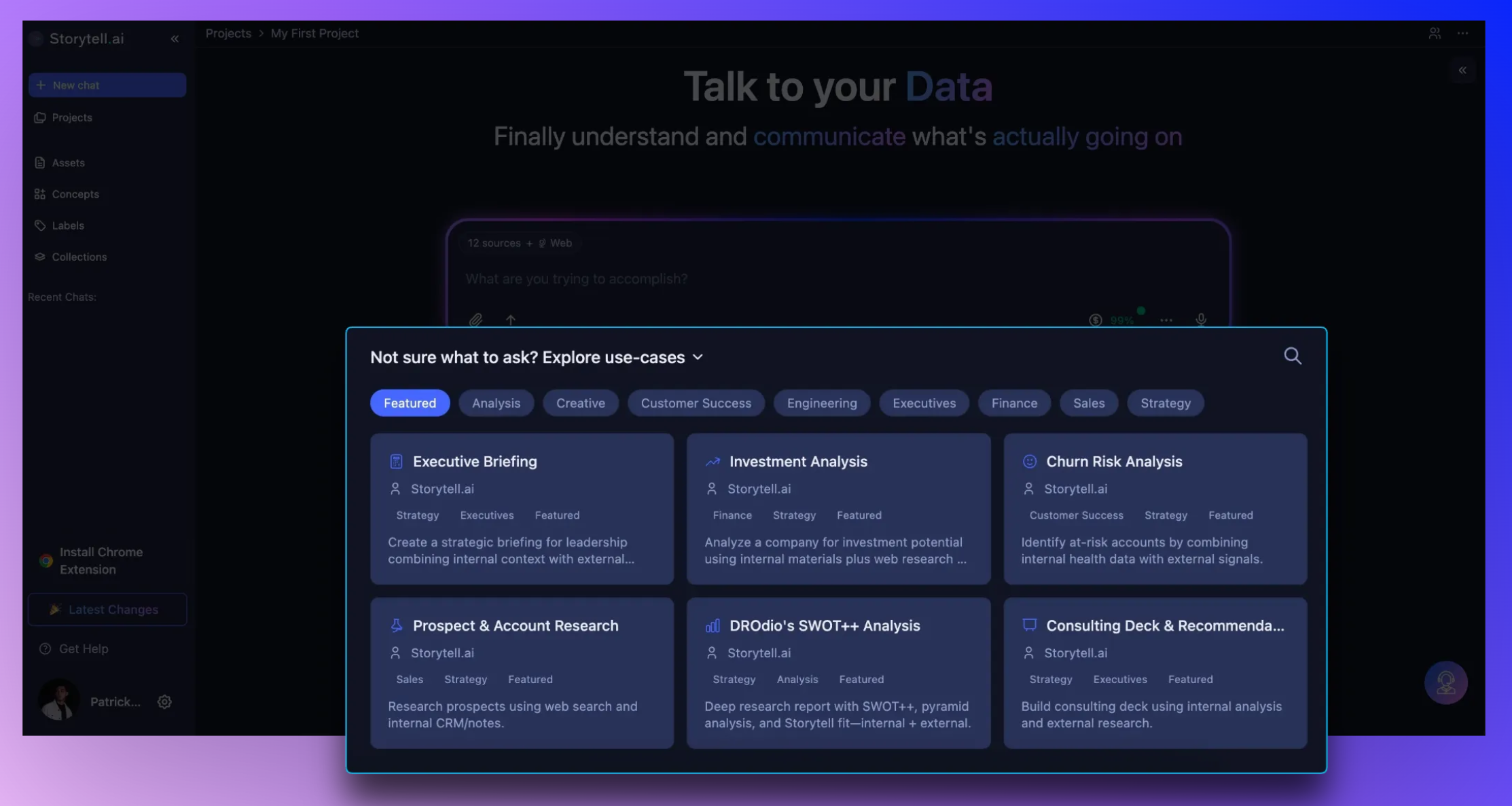 New users can now discover common use cases and jump straight into Storytell without needing to figure out where to start. Featured Prompts surface the best prompts upfront, while categories, search, and use case examples ensure power users can find exactly what they need.