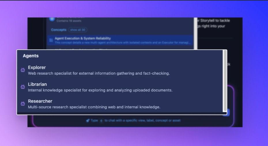 What are agents? Think of them as expert assistants who work behind the scenes on specific parts of your request. When you ask Storytell to do something complex—like researching a topic across multiple sources or digging through your entire document library—Storytell can now delegate that work to specialized agents who are optimized for exactly that task.
