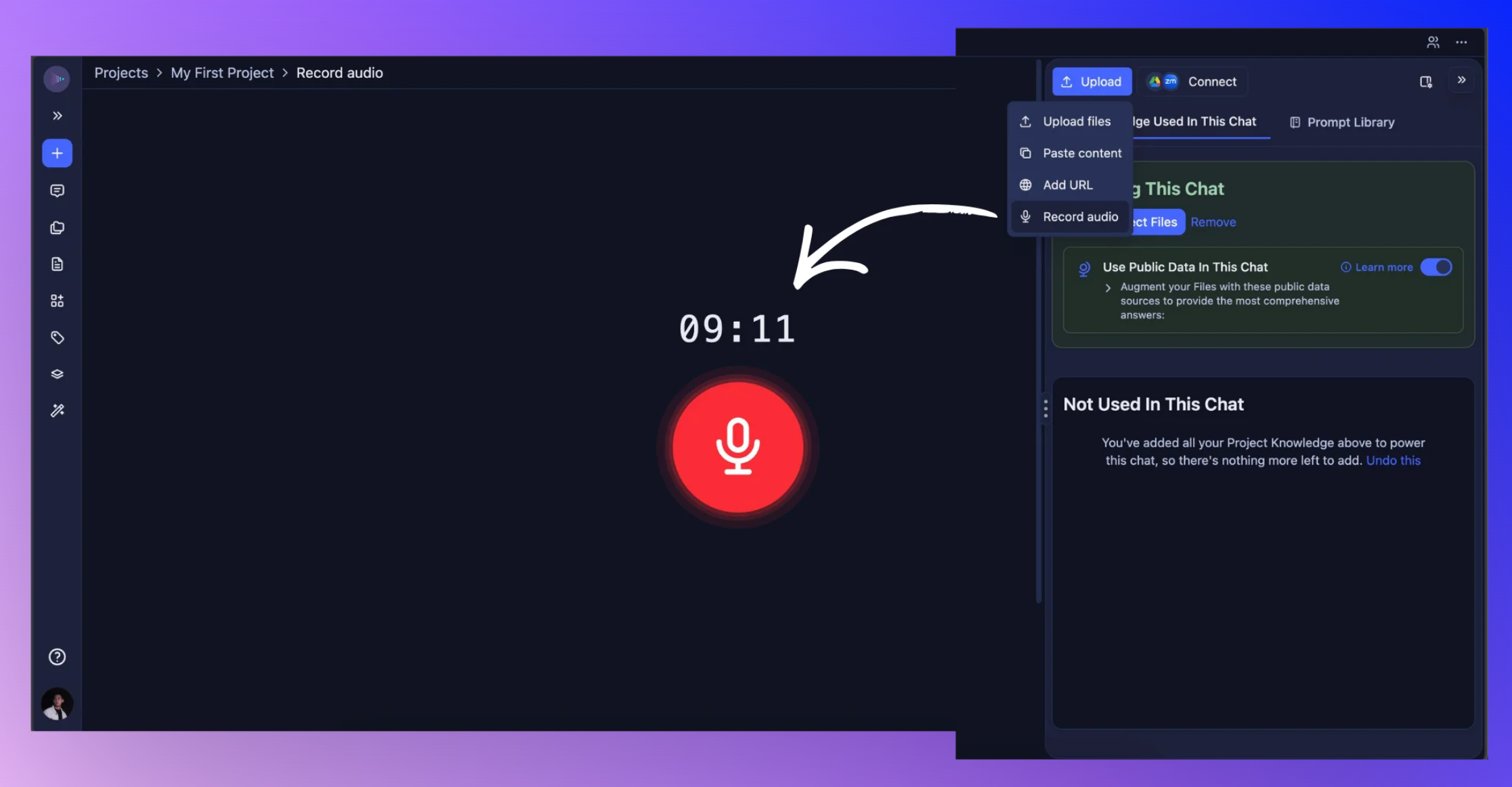 Record from the Upload Panel: Use the Record option to capture audio using your device’s microphone and save it to your project.