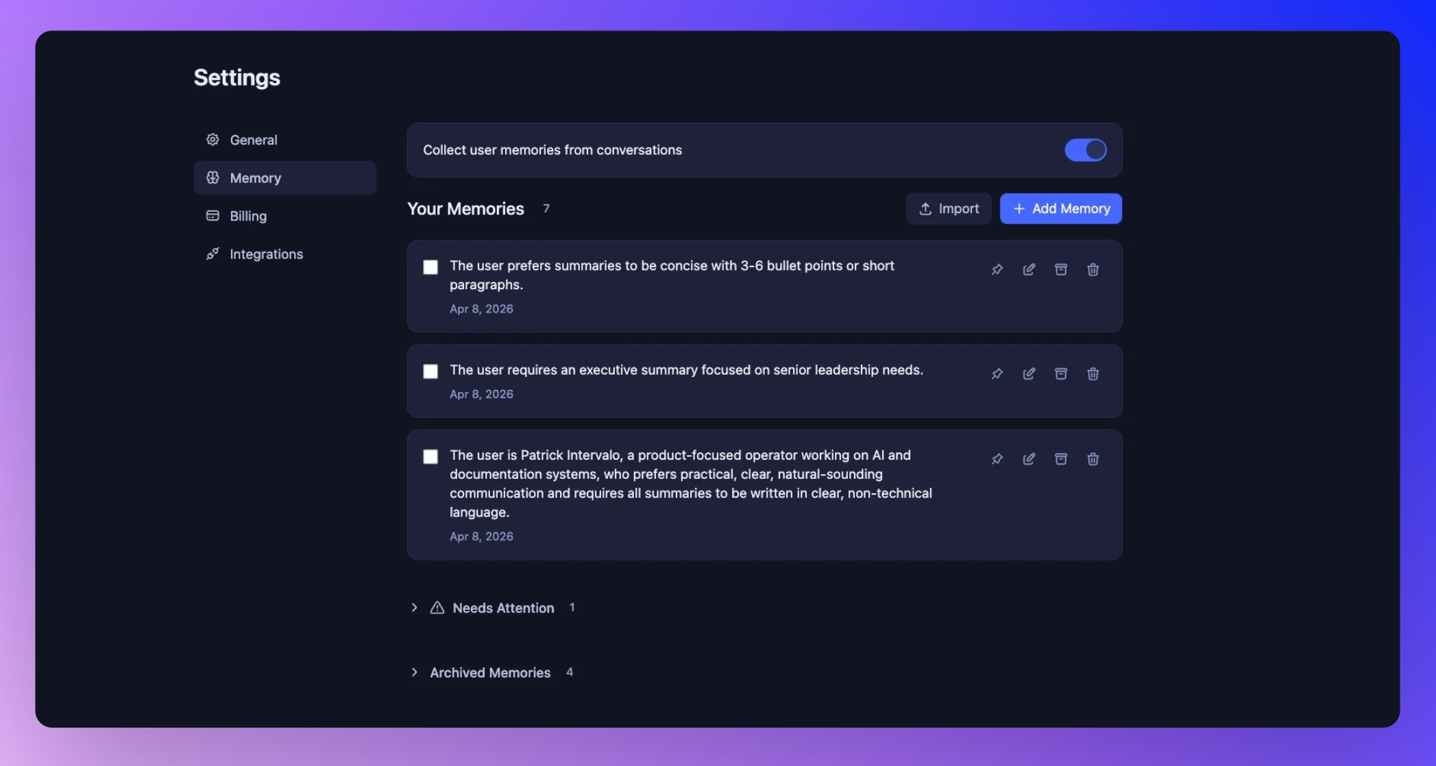 • Edit, delete, or archive memories