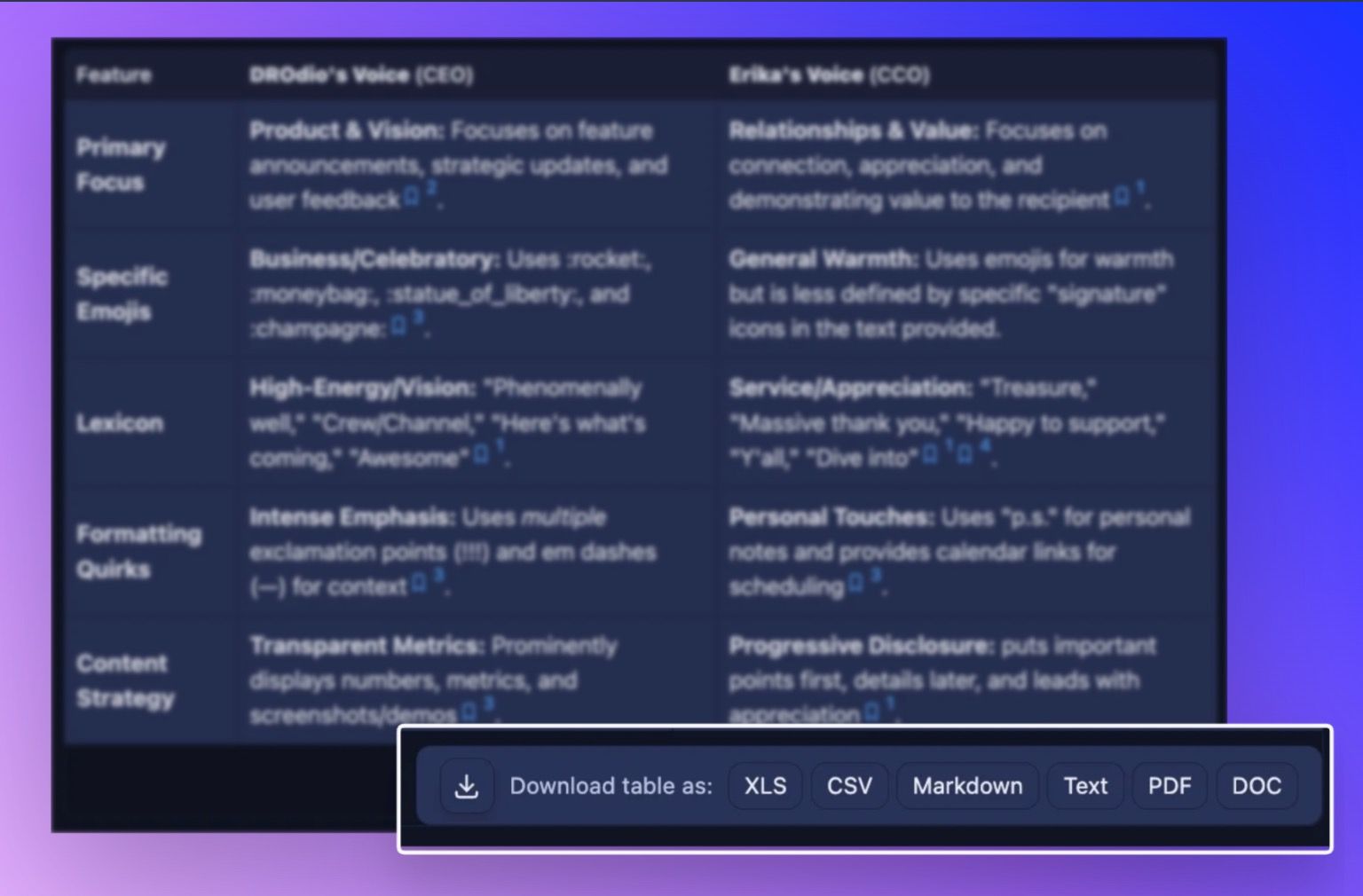 Every table and full answer in SmartChat™ now has a download button with six different export options: