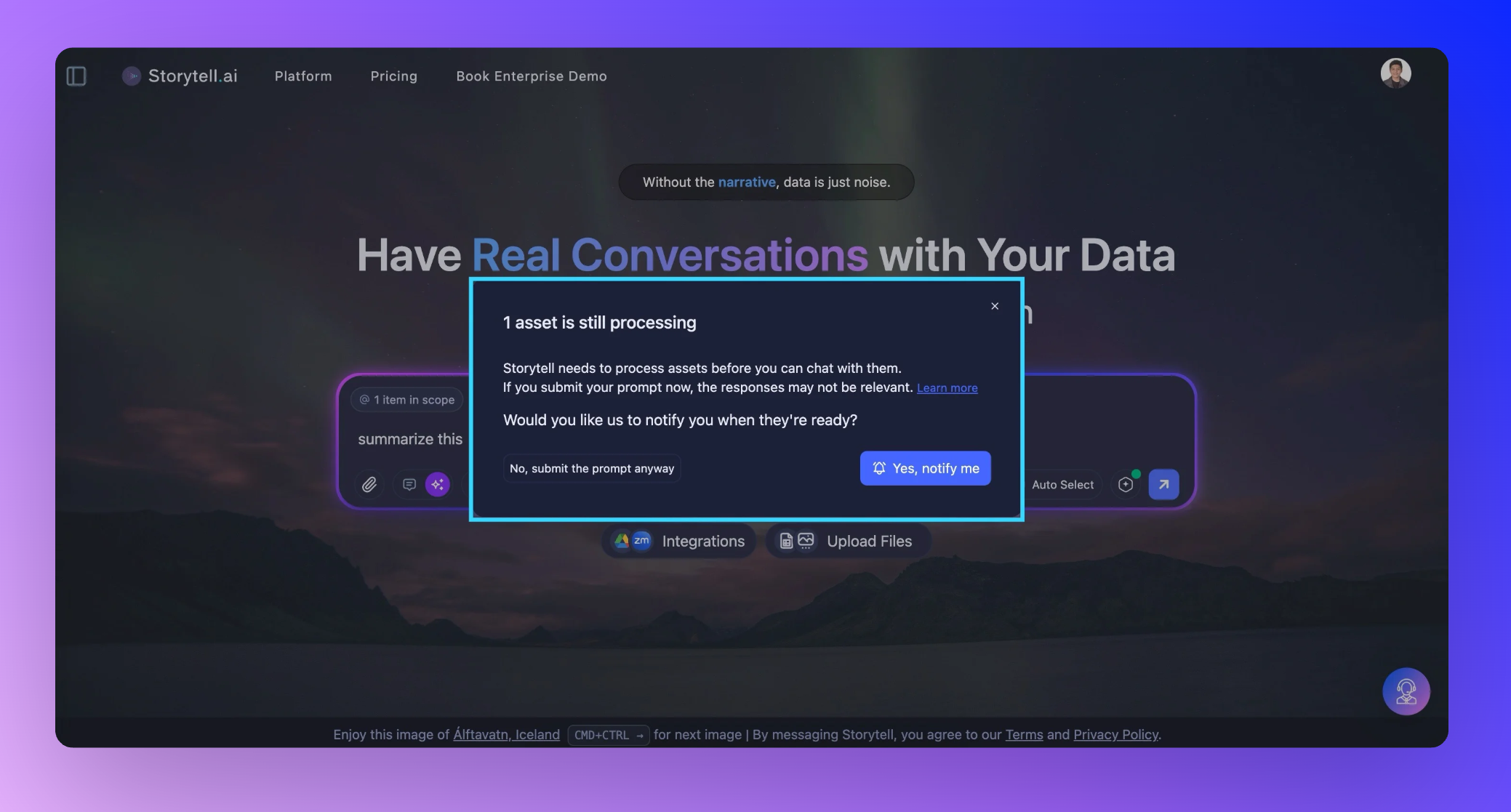 You get to choose: Wait for best results and be notified when everything’s ready, or go ahead and submit your prompt anyway—even if it means Storytell might not have the full picture (yet).
